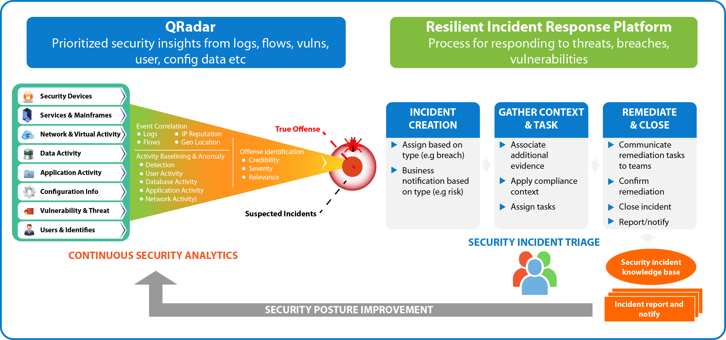IBM SOAR tích hợp 2 chiều với IBM QRadar, cho phép tổ chức phát hiện và xử lý sự cố an toàn thông tin với sự tham gia của cả Con người, Quy trình và Công nghệ